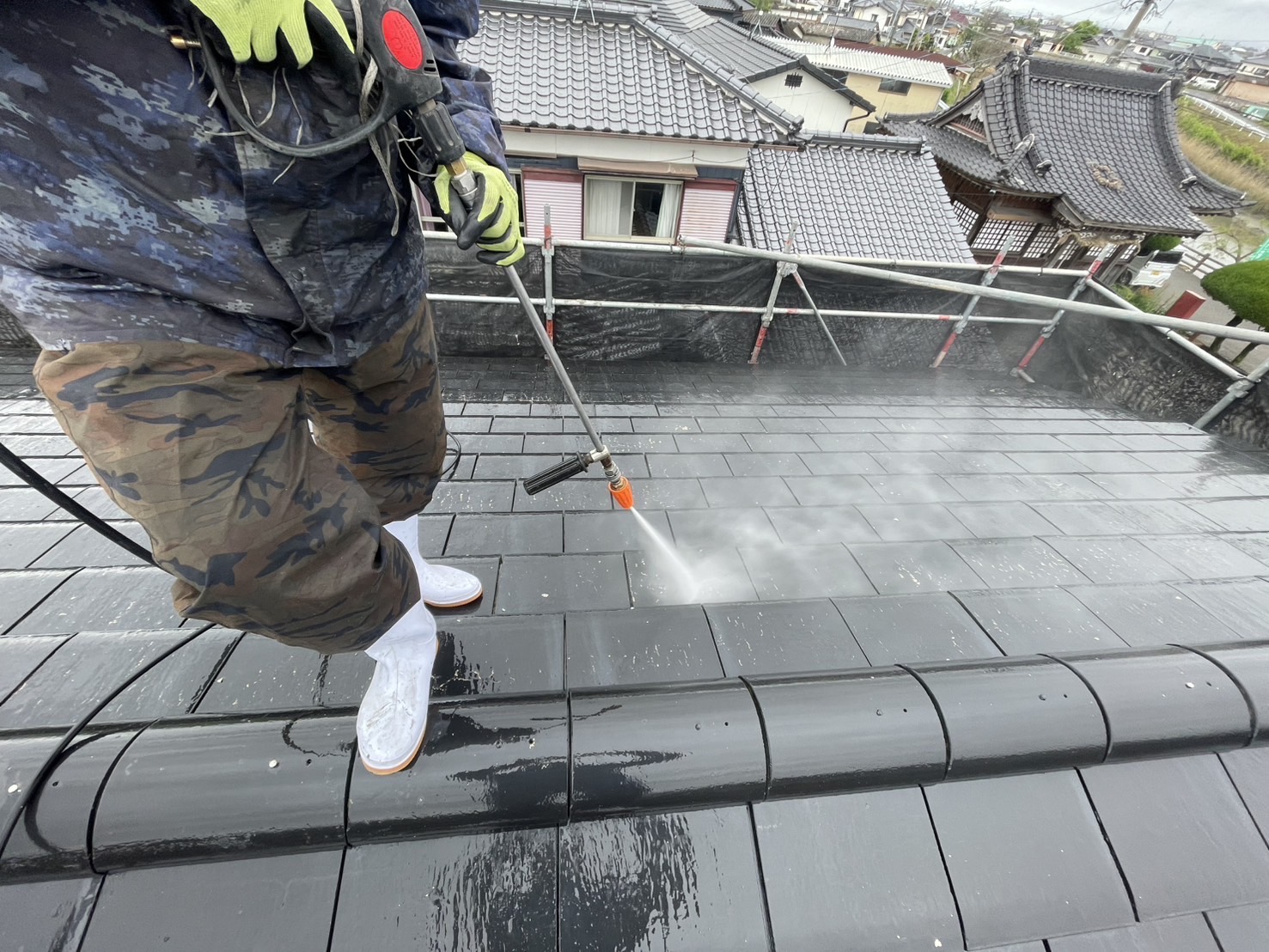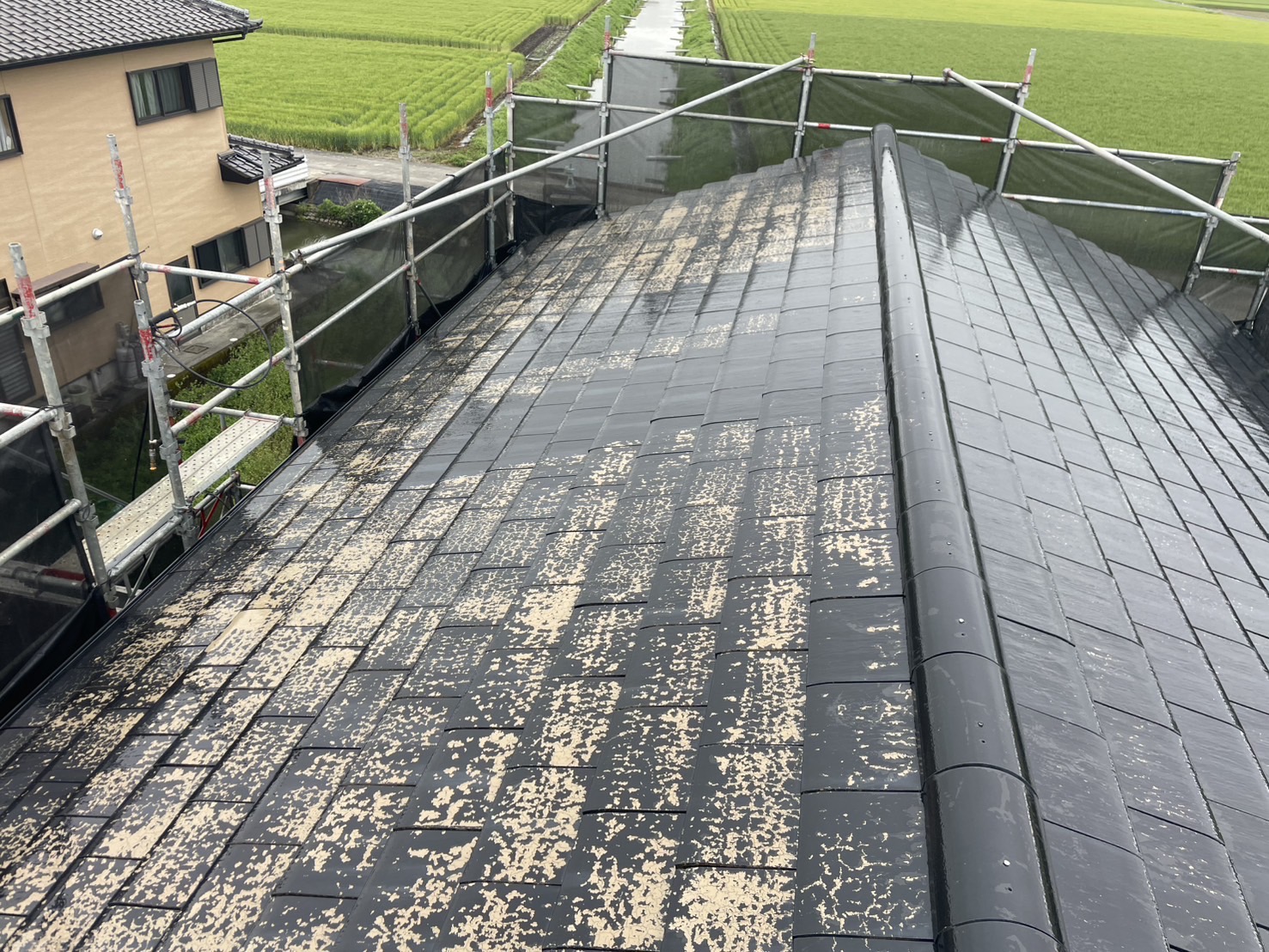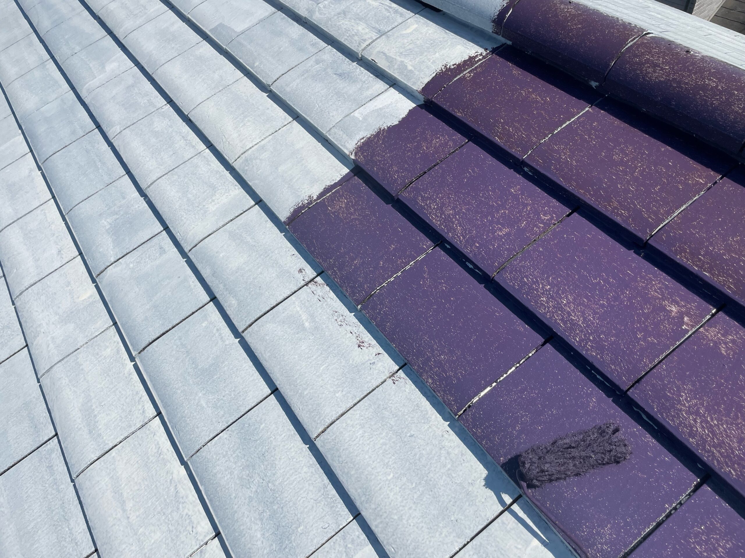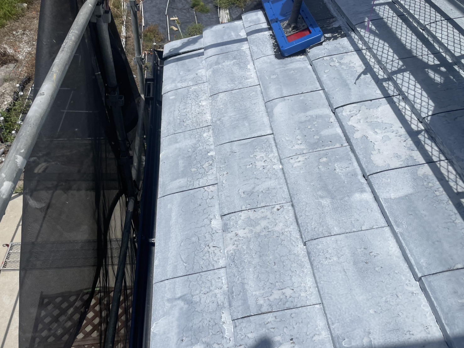 屋根半分ケレン・洗浄後です。施工前の半分部分と比較してもかなり旧塗膜を落としました。モニエル瓦は塗装が剥げやすい特徴がある屋根材なので可能な限り旧塗膜を落とします